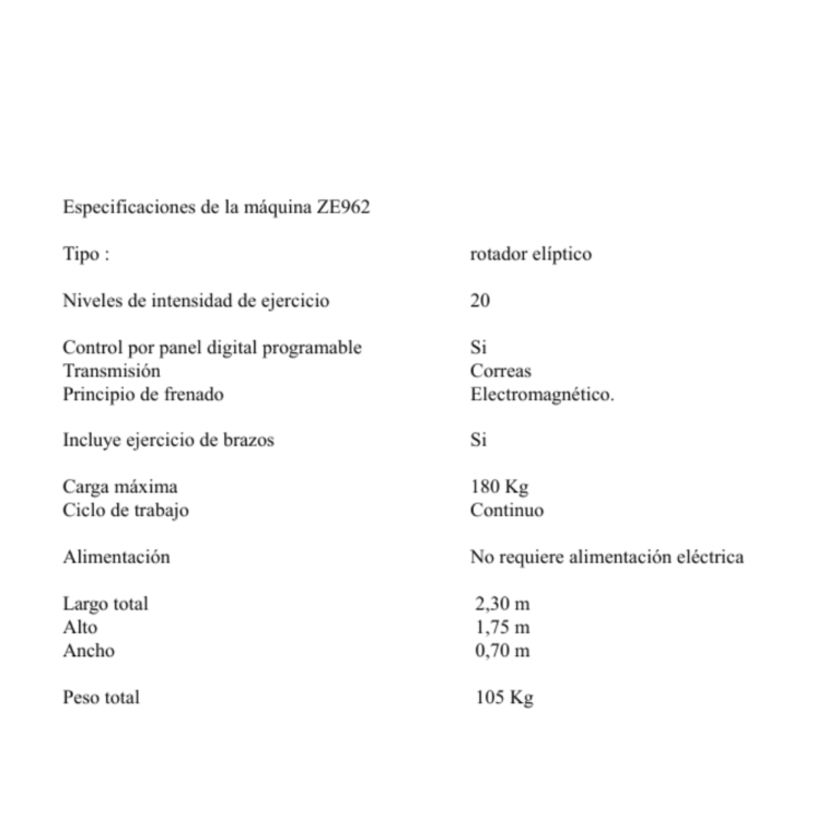ELIPTICO ZAG TECHNOLOGY ZE - 962 CARACTERÍSTICAS Panel de control digital multicolor.Nivel de resistencia, tiempo y distancia programables.Cinco programas preestablecidos.Andar suave y sereno gracias al frenado electromagnético y a la transmisión por correas.Ergonómico, la rampa curva y los pedales amortiguados evitan sobrecargas en las articulaciones. Manijas móviles para trabajo de brazosLibre de cables, NO necesita conexión a 220V, reutiliza la energía del ejercicio.Su robustez y confiabilidad son aptas para uso profesional, típicamente se la encuentra en gimnasios, hoteles.Para usuarios de hasta 160 Kg. ESPECIFICACIONES TÉCNICAS Plazo de entrega máximo 30 días Flete a cargo del cliente